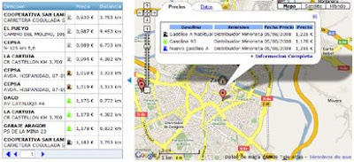 This Google Map will find the cheapest gas stations for locations in Spain. The map has a search engine so you can search for any location in the country and the results are then tagged on a Google Map. Clicking on a tag reveals the current price for gas at that gas station. The prices are all scraped from the website of the Ministry of Industry so should be very accurate.